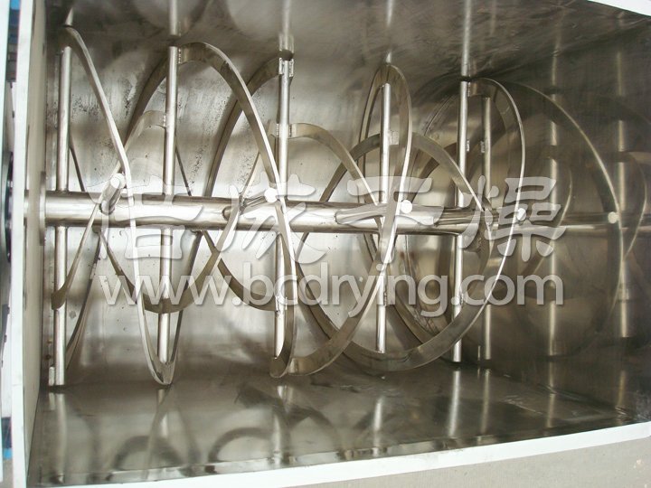 該機(jī)型由容器、螺旋攪拌葉片和傳動部件組成:螺旋葉片一般做成雙層或三層,外層螺旋將物料從兩側(cè)向中央?yún)R集,內(nèi)層螺旋將物料從中央兩側(cè)輸送,形成對流混合。