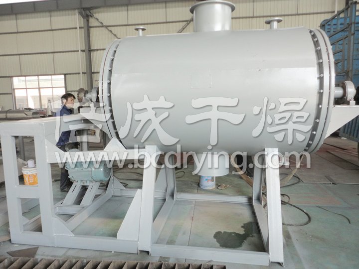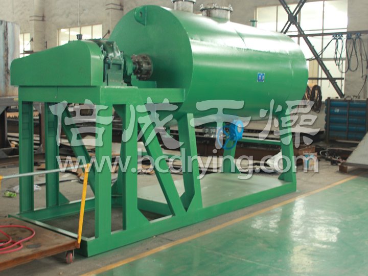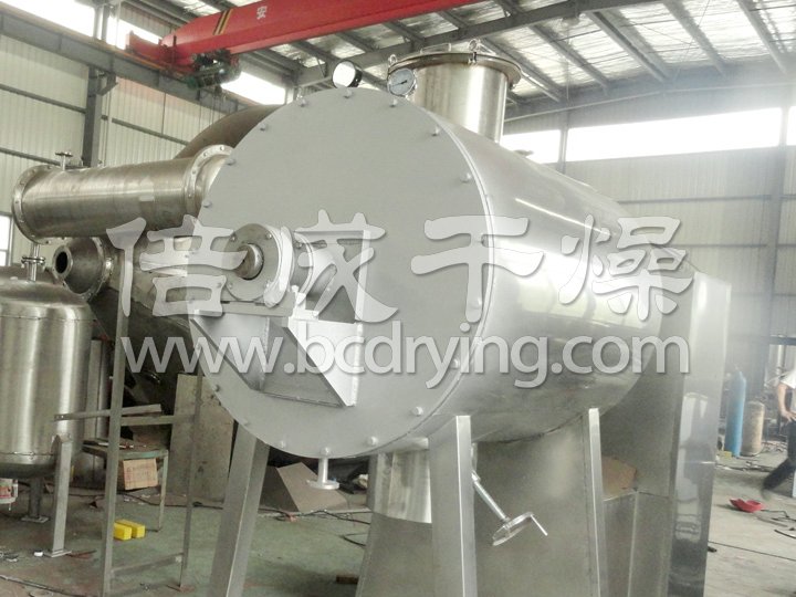 本機是一種新穎臥式間歇式真空干燥設(shè)備,濕物料經(jīng)傳導(dǎo)蒸發(fā),帶有刮板攪拌器不斷清除熱面上的物料,并在容器內(nèi)推移形成循環(huán)流,水份蒸發(fā)后由真空泵抽出。